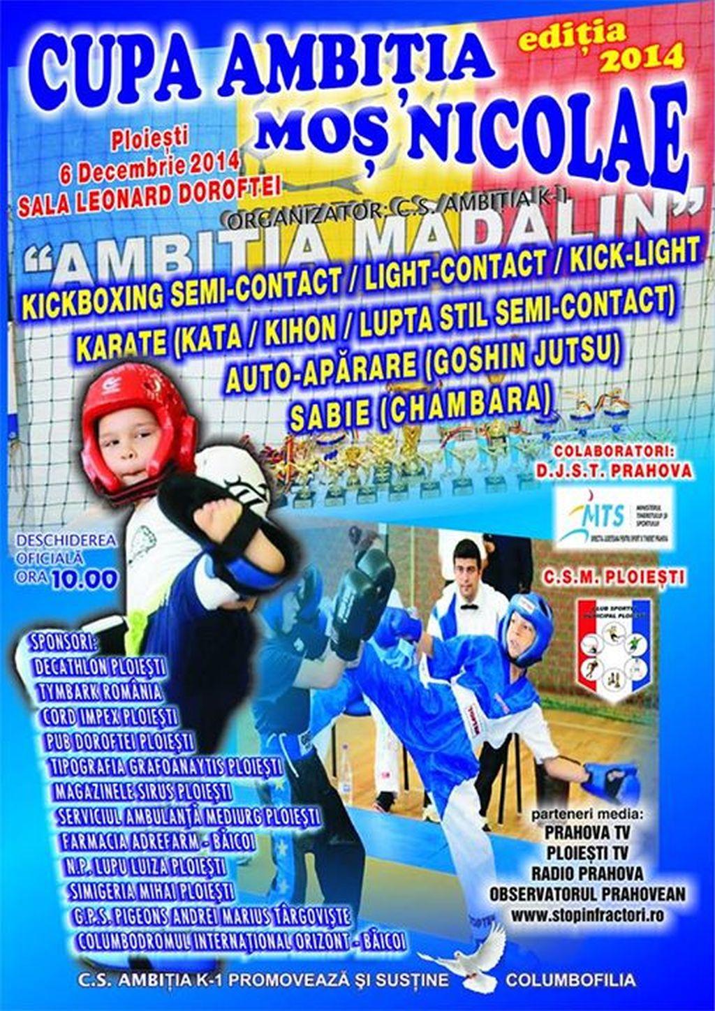 Mâine, începând cu ora 10.00, Sala „Leonard Doroftei” va găzdui o interesantă competiţie de arte marţiale organizată de CS Ambiţia K1, în colaborare cu CSM Ploieşti şi DJTS Prahova. Sub titulatura Cupa Ambiţia „Moş Nicolae”, evenimentul va aduna la start peste 120 de sportivi, care se vor întrece în diferite stiluri, precum kickboxing semi-contact, light-contact, kick-light, karate (kata, kihon, luptă stil semi-contact), auto-apărare (Goshin Jutsu) şi Sabie (Chambara).