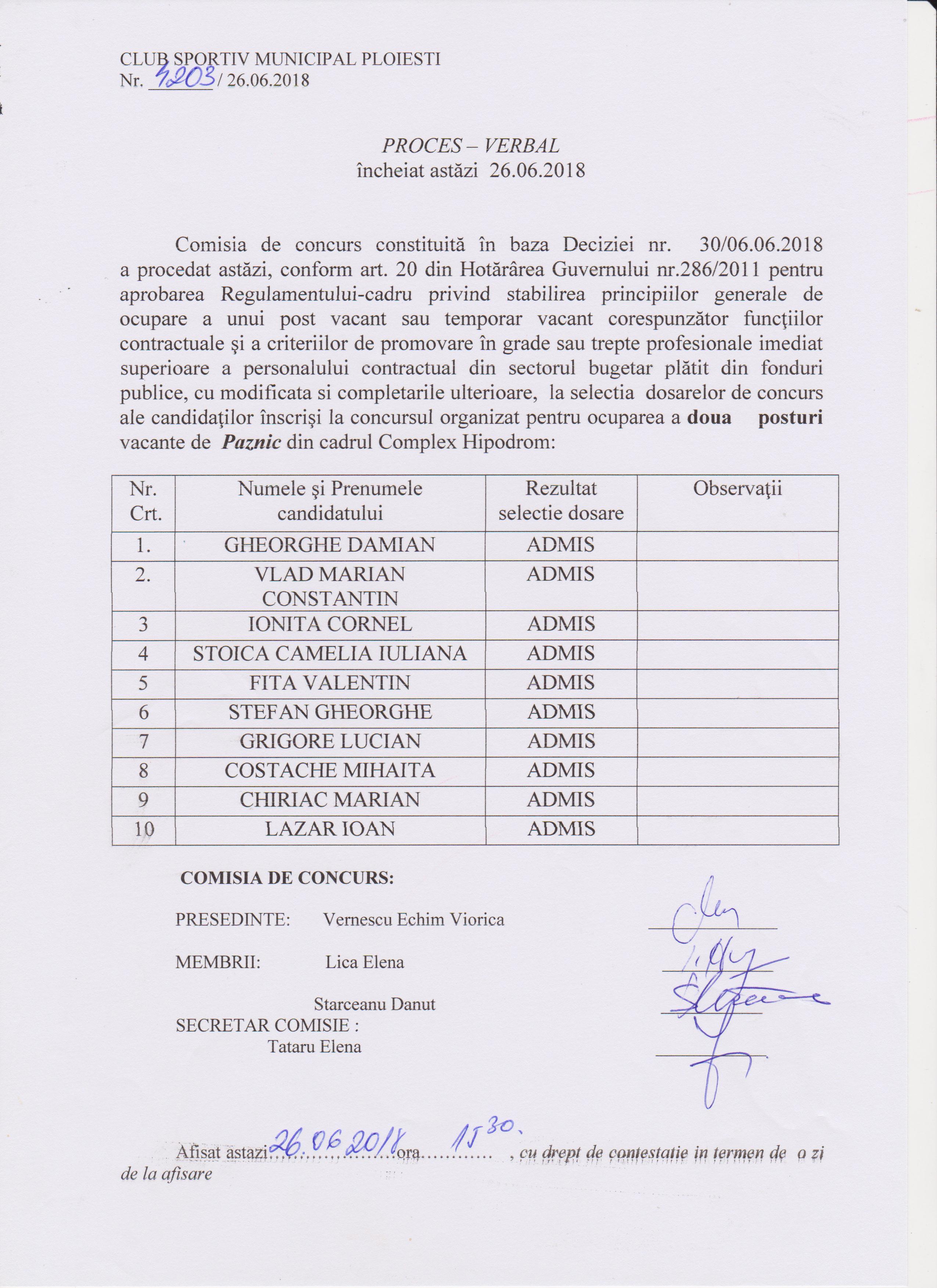 Proces verbal selectie dosare Paznic Complex Hipodrom