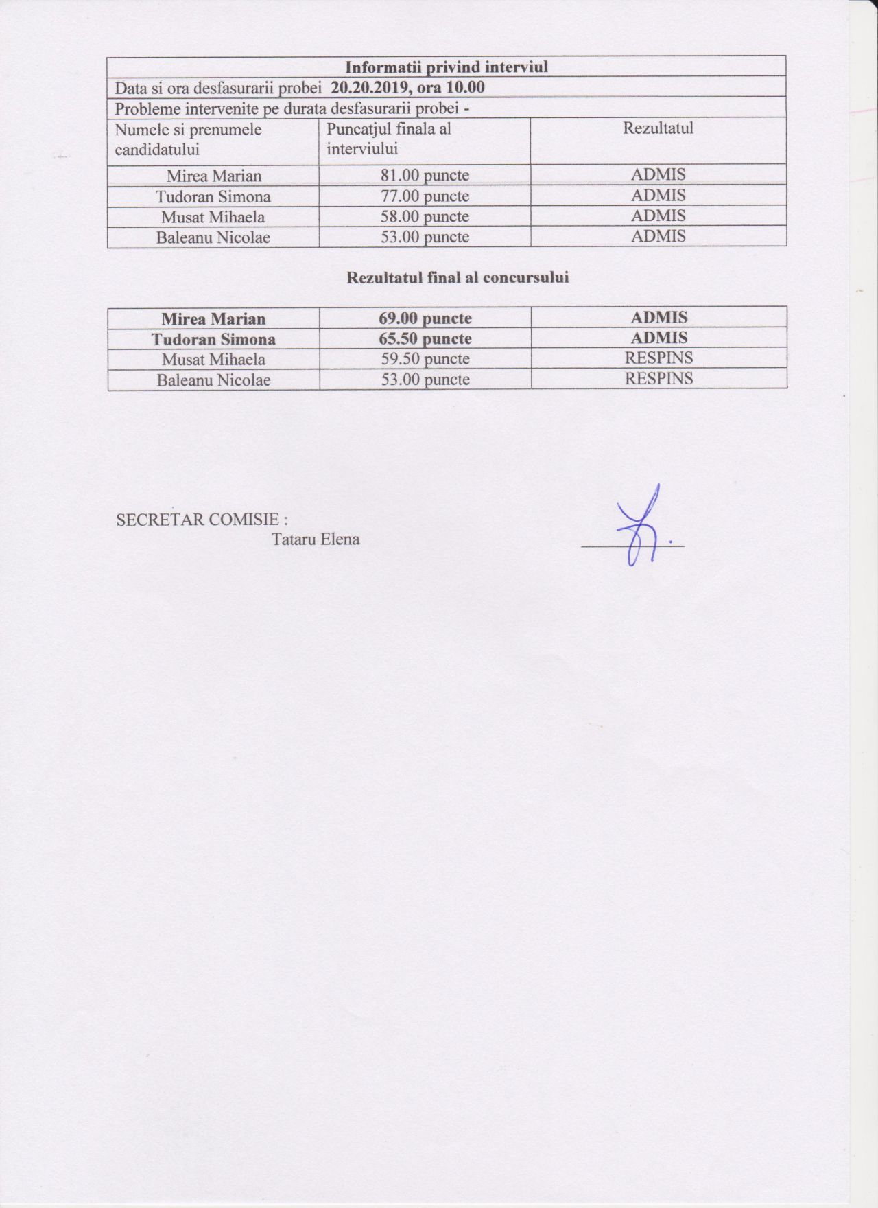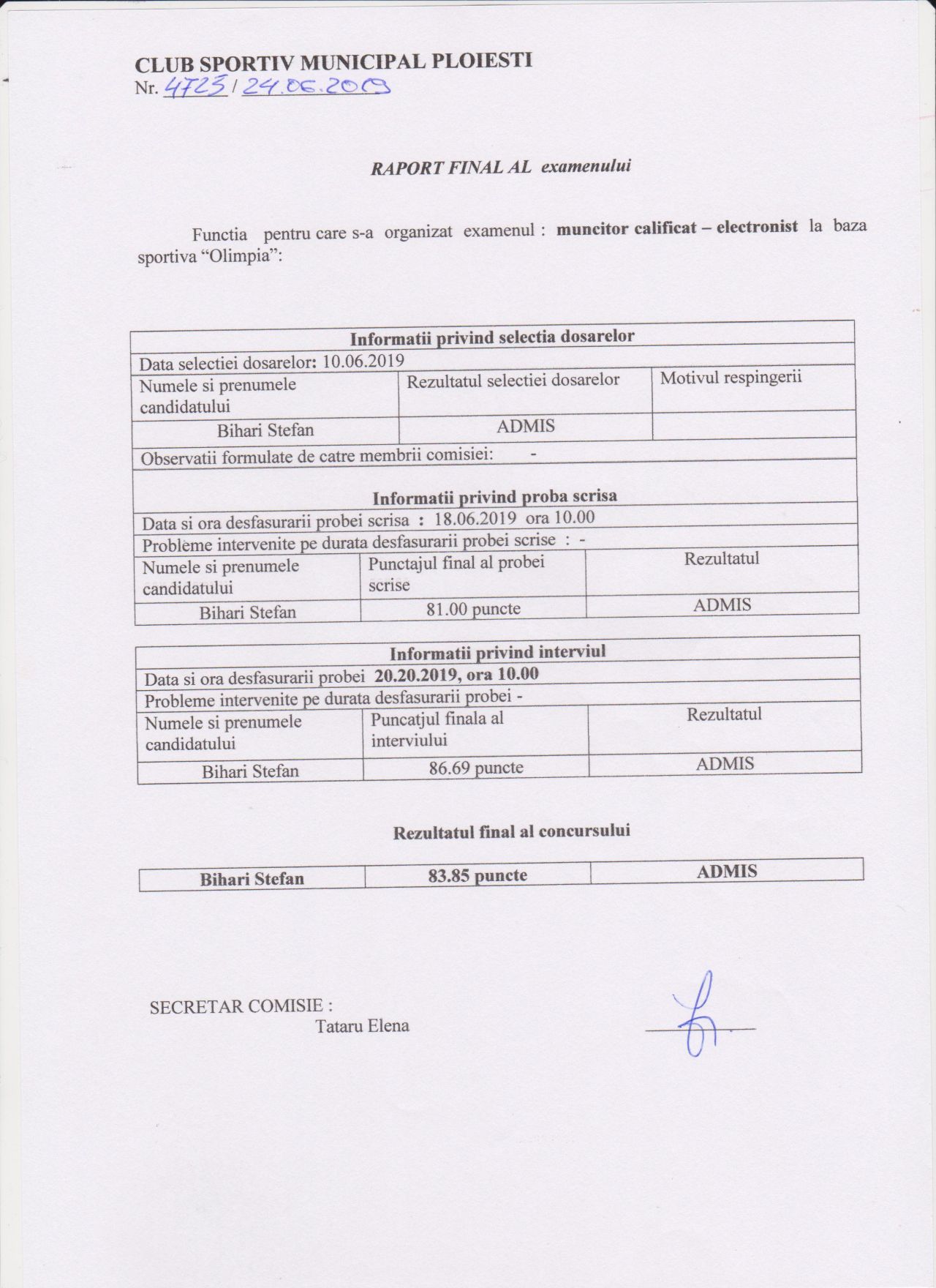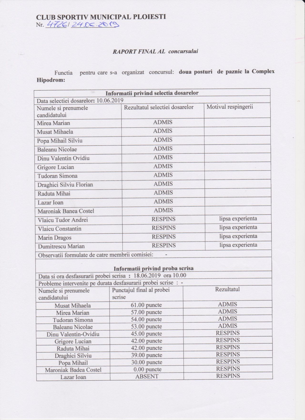 Rapoarte finale concursuri angajare CSM Ploieşti – electronist si paznic