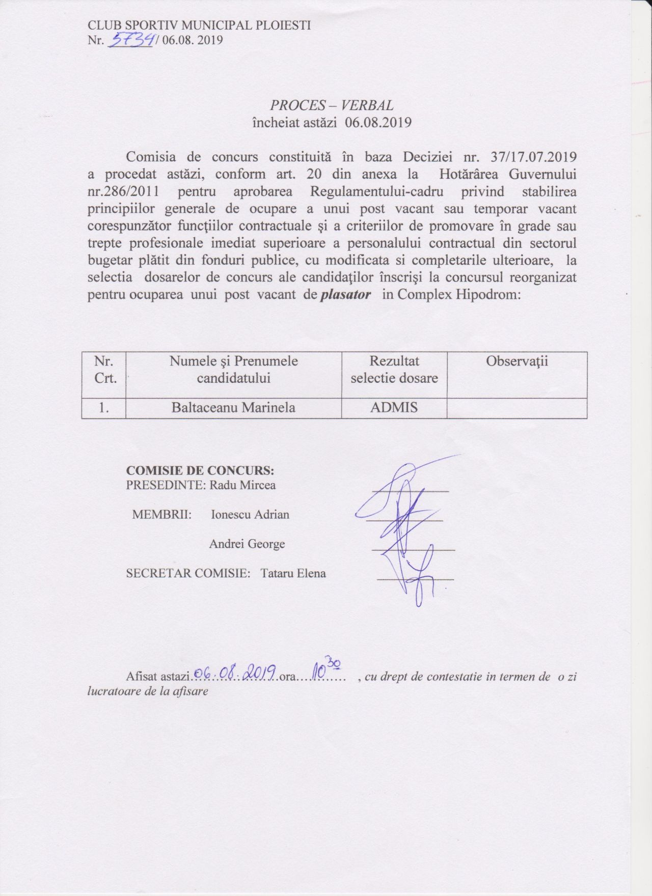 Proces verbal selecţie dosare angajare CSM Ploieşti – plasator Complex Hipodrom