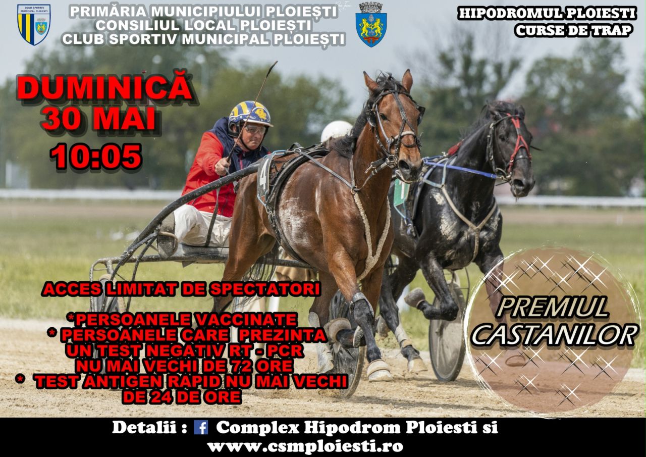 Duminică, 30 mai, pe Hipodromul Ploieşti va avea loc cea de-a treia reuniune hipică oficială din acest an, în cadrul căreia sunt programate cinci curse de trap, cu principal punct de atracţie „Premiul Castanilor”.