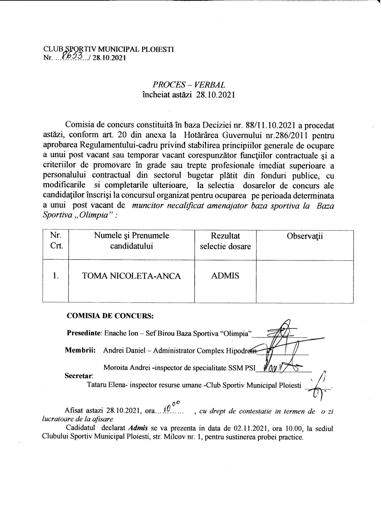 Proces verbal selecţie dosare muncitor necalificat Sala „Olimpia”