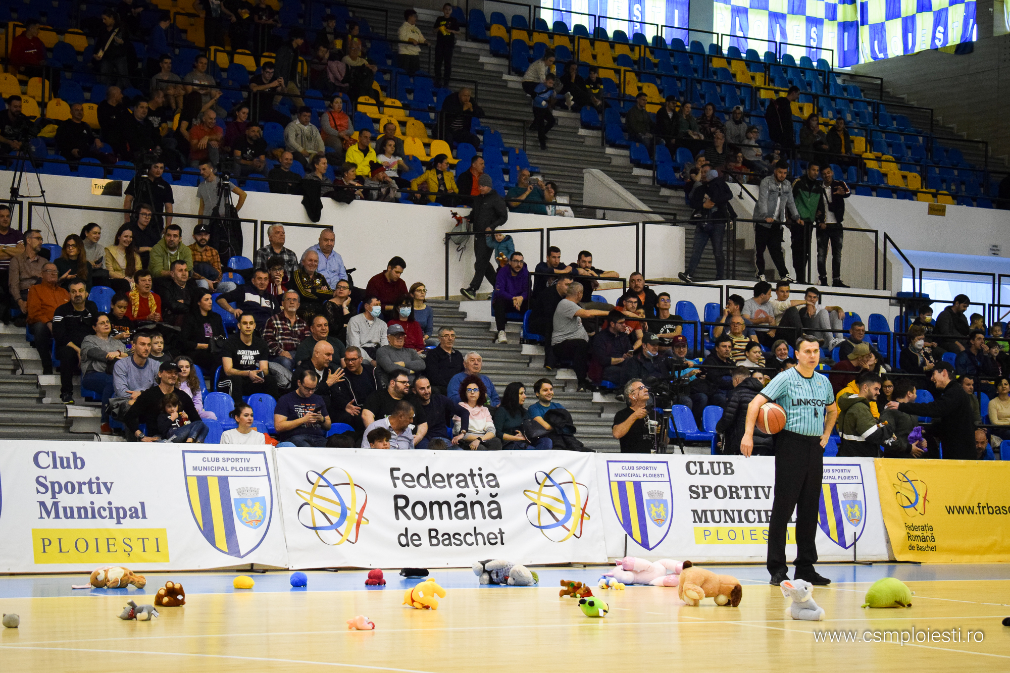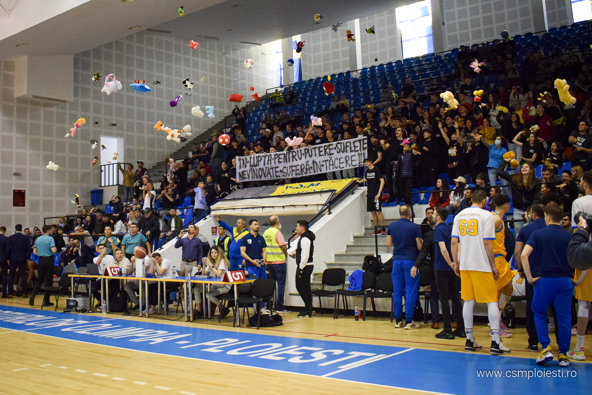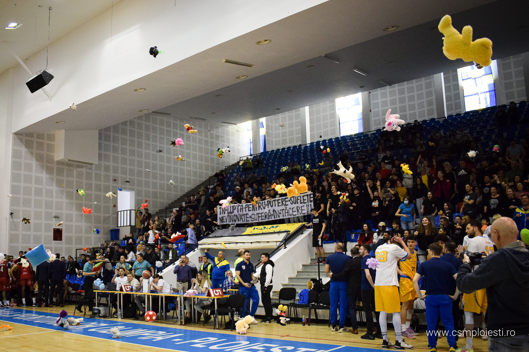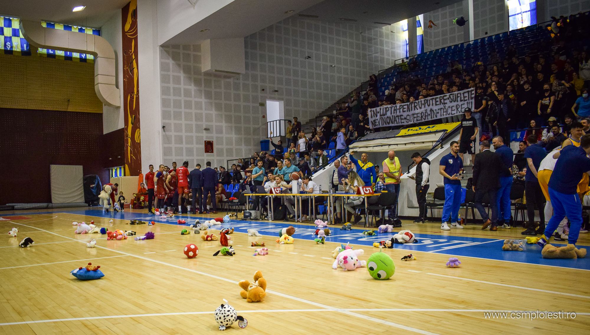 Probabil că un motiv în plus pentru ca ploieştenii să vină, în această seară, la sală a fost reprezentat şi de acţiunea caritabilă ce a fost organizată, la iniţiativa galeriei, pentru întrajutorarea copiilor ucraineni care sunt găzduiţi în judeţul nostru de Asociaţia Pro Vita „Sfântul Brâncoveanu”, din comuna Poseşti. Înainte de startul partidei, zeci de jucării de pluş au zburat pe teren, iar acestea vor ajunge, în cursul săptămânii viitoare, la copiii care, fără voia lor, ne-au devenit vecini şi prieteni în ultima lună. Vă mulţumim că aţi dat curs demersului fanilor!