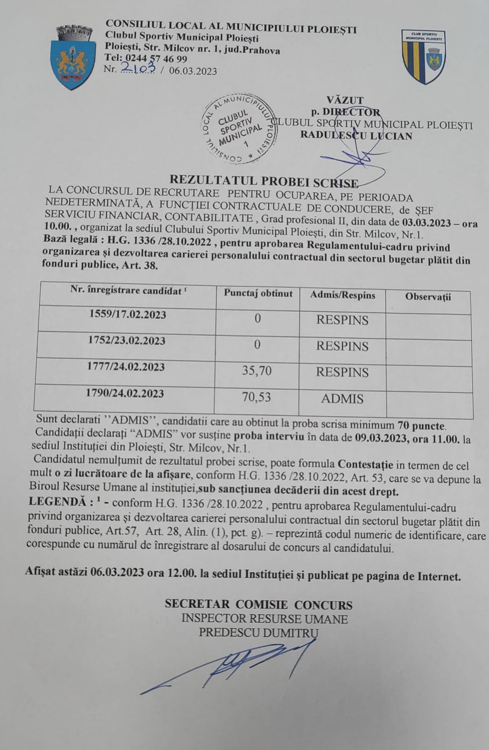 martie66 martie 2023Borderou notare proba scrisă concurs angajare Şef Serviciu Financiar ContabilitateDe CSM PloiestiIn Anunturi