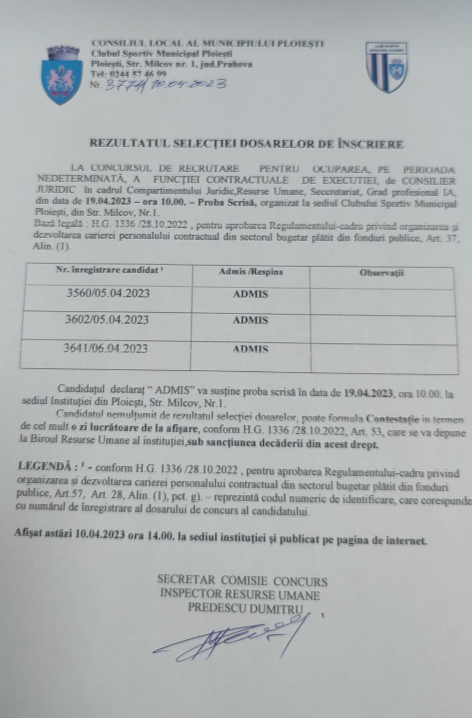 aprilie1010 aprilie 2023Selectie dosare concurs angajare CSM Ploieşti – Consilier Juridic, Grad profesional IA, în cadrul Compartamentului Juridic, Resurse Umane, SecretariatDe CSM PloiestiIn Anunturi