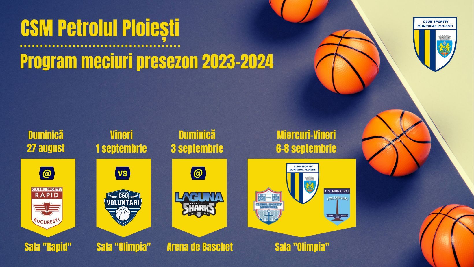 CSM Petrolul Ploieşti se va pregăti numai acasă până la startul sezonului 2023-2024, urmând să dispute şi cinci meciuri de verificare: trei în Sala Sporturilor Olimpia şi două în deplasare. Seria amicalelor va debuta duminică, 27 august, cu o deplasare la Rapid Bucureşti şi va continua, în „Olimpia”, cu întâlnirea de vineri, 1 septembrie, cu CSO Voluntari. Va urma jocul din deplasare, de duminică, 3 septembrie, de la Laguna Sharks, după care, în perioada 6-8 septembrie, la Ploieşti va avea loc un turneu în trei, cu CSM Galaţi şi CSM Focşani, în cadrul căruia se va juca „fiecare cu fiecare” după următorul program: CSM Petrolul Ploieşti – CSM Galaţi (miercuri, 6 septembrie), CSM Galaţi – CSM Focşani (joi, 7 septembrie) şi CSM Petrolul Ploieşti – CSM Focşani (vineri, 8 septembrie).