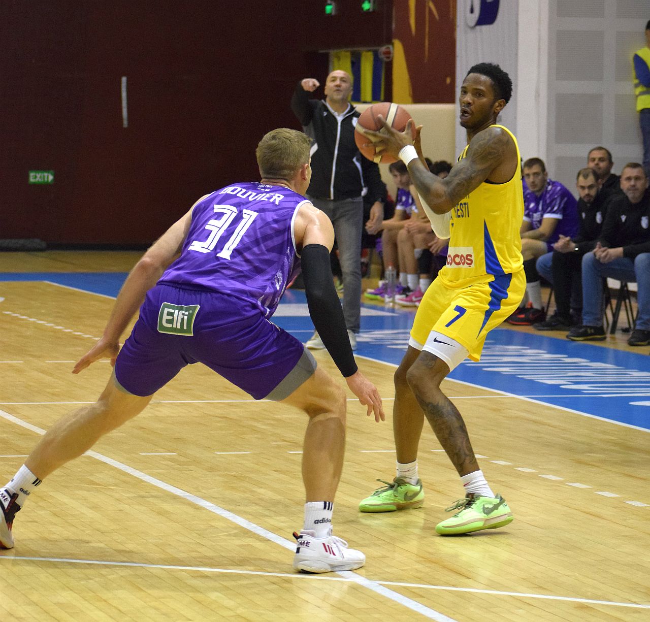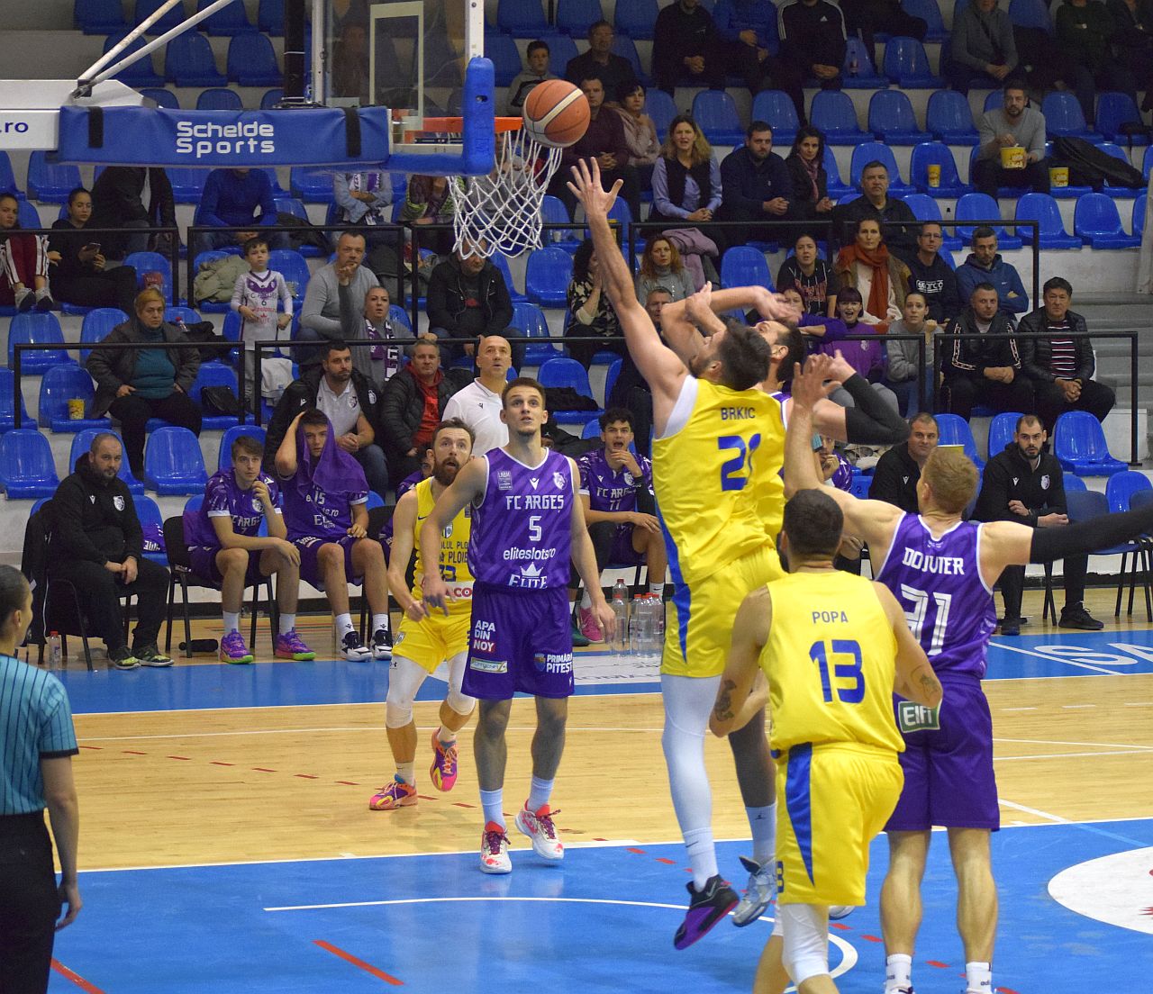 La fel ca în disputa cu Craiova, prima repriză a fost ok, în ciuda unui debut mai anevoios, punctat de reuşitele piteşteanului Andrieş, care a înscris de trei ori consecutiv de la distanţă şi îi distanţa pe oaspeţi la 15-8 (minutul 5). Time-out-ul lui Mihai Popa a pus, însă lucrurile în ordine, iar „galben-albaştrii” au revenit rapid, oferind, chiar, un adevărat spectacol ofensiv până la pauza mare, când au condus cu 44-42.