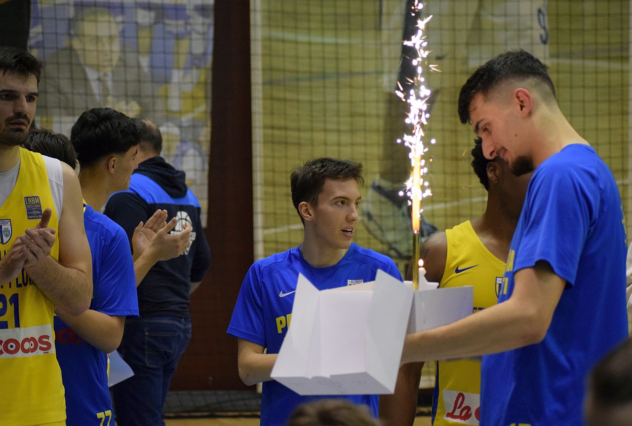 Lorenzo Diaconescu a împlinit chiar astăzi 19 ani şi a onorat evenimentul cu cea mai bună evoluţie a sa în acest sezon al Ligii Naţionale, reuşind 6 puncte, 4 recuperări şi 3 pase decisive în puţin peste 21 de minute petrecute pe parchet. Din păcate, nu a fost să fie şi o victorie a echipei în meciul din această seară, dar apropiaţii i-au pregătit o surpriză şi, imediat după meci, i-au făcut cadou un tort, cântându-i „La mulţi ani”! alături de colegii de echipă.