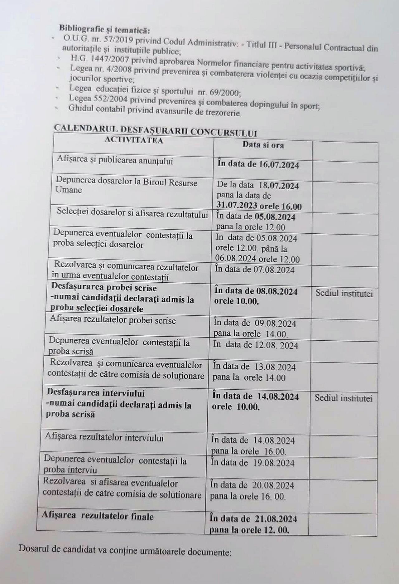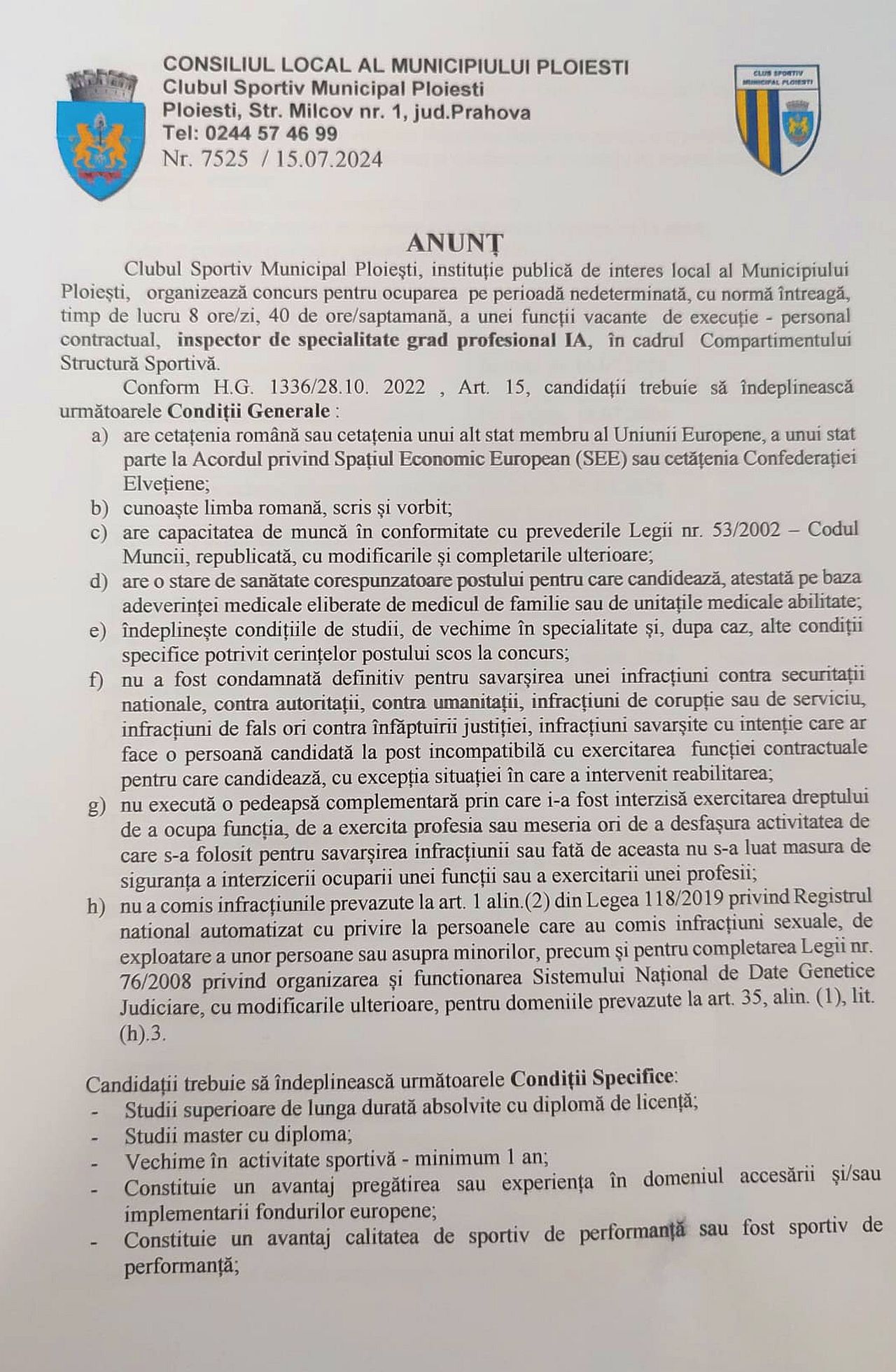 Anunţ concurs angajare CSM Ploieşti – inspector de specialitate grad profesional IA, în cadrul Compartimentului Structură Sportivă