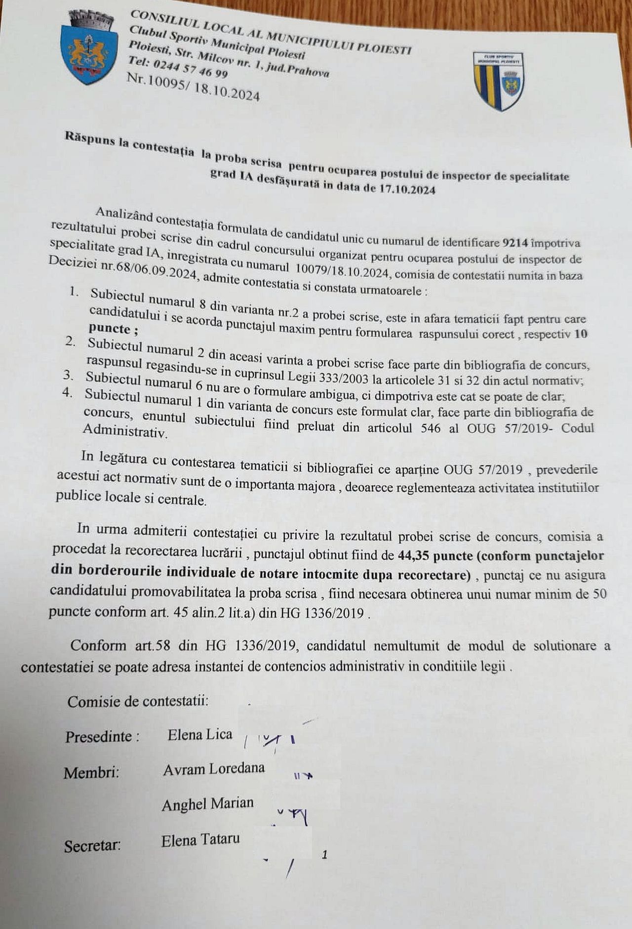 Răspuns contestaţie proba scrisă concurs angajare CSM Ploieşti – inspector de specialitate grad profesional 1A, în cadrul Complexului Hipodrom