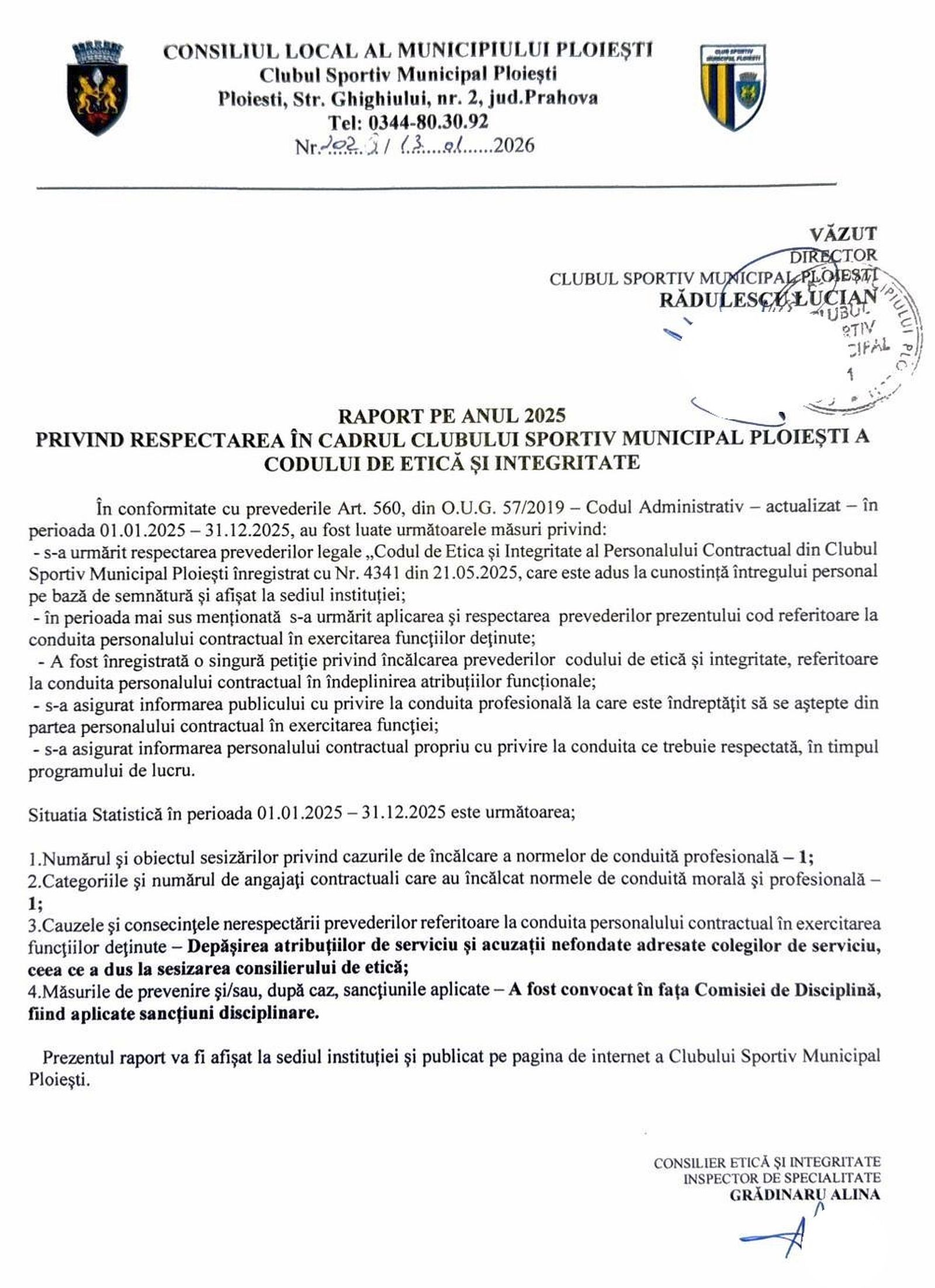 ianuarie1319 ianuarie 2026Raport pe anul 2025 privind respectarea în cadrul CSM Ploieşti a codului de etică şi integritateDe CSM PloiestiIn Informatii publice