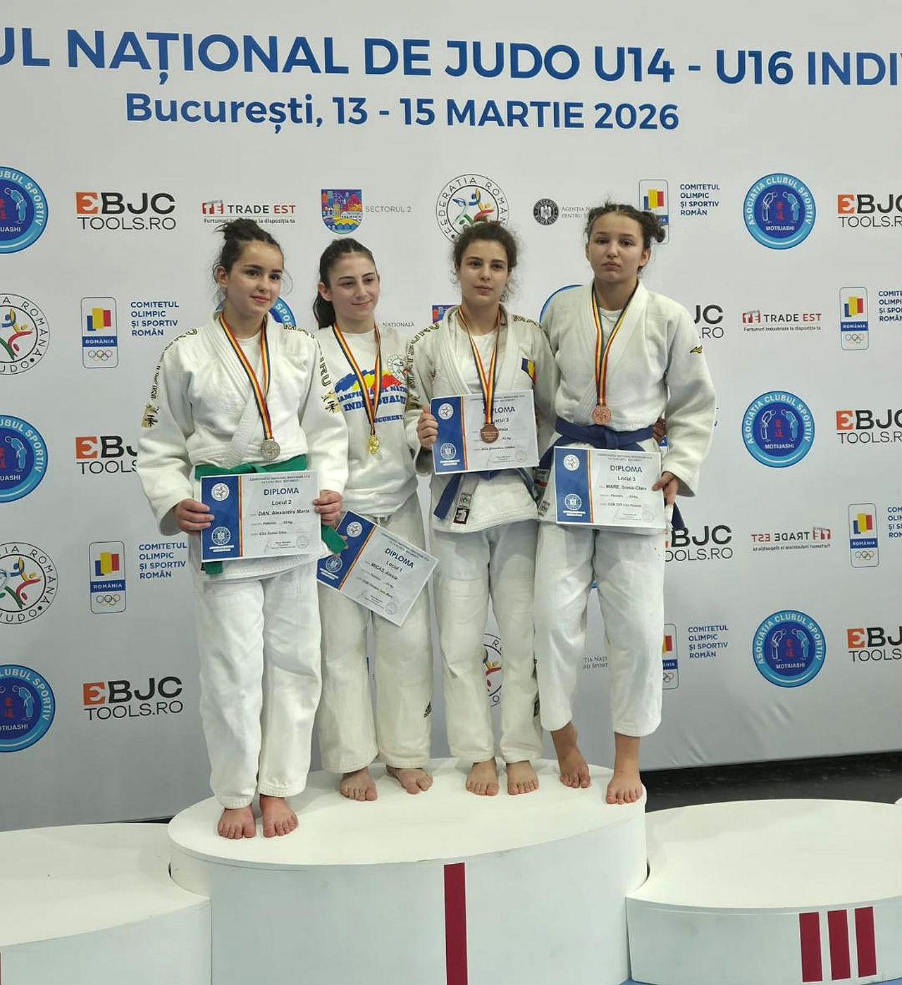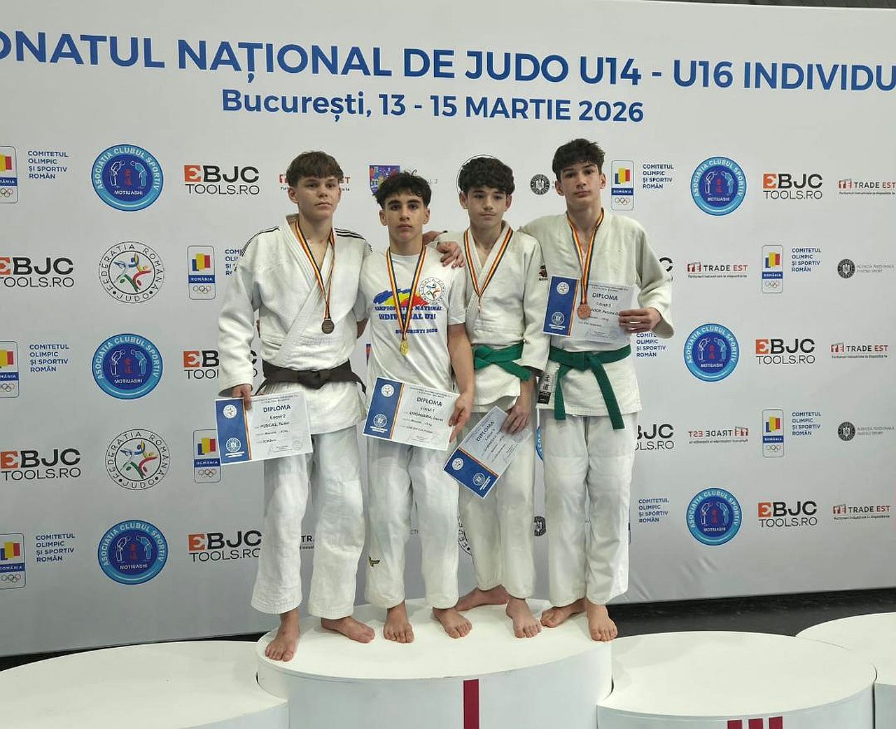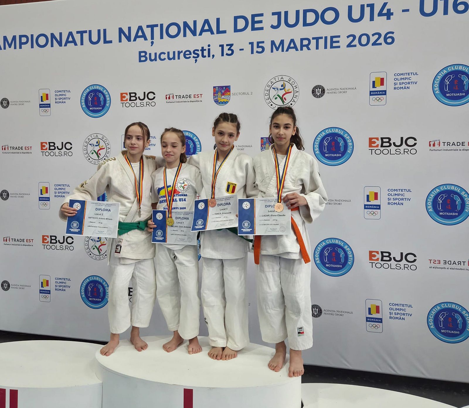 Cei trei campioni au luptat la categoria „U16” şi sunt Lucas Chighvaria (-55 kg), Rafaella Galaţchi (-44 kg) şi Ştefania Popescu (-48 kg). Pe ultima treaptă a podiumului au urcat Sonia Mare, la U16, categoria „-52 kg”, şi Claudia Lazăr, la U14, categoria „-36 kg”.